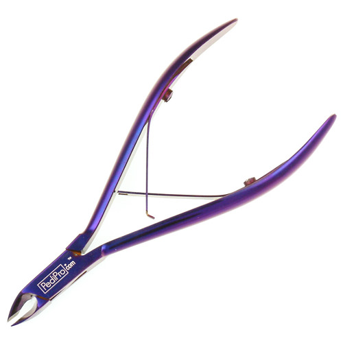 Cuticle Nipper with 4mm offset jaw. Surgical quality stainless. Titanium coated color. Box joint, double leaf spring, 11cm (4.5 inches) long.