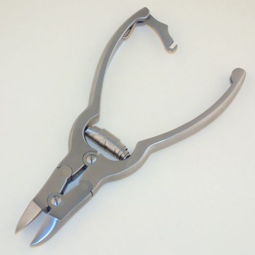 Nail Cutter with compound dual-joint action makes cutting heavy nails easy. Gently curved cutting edge, barrel spring, rear locking mechanism, six 1/4 (6.25) inches, stainless steel, satin finish.