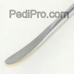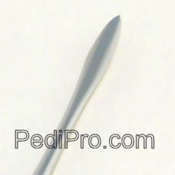 Spatula with flatten spoon shape on one end and lance on other end. Octagonal (eight-sided) serrated handle, six (6) inches, stainless steel, polished finish.